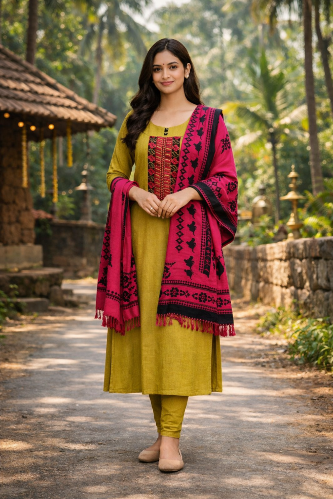 The fabric is soft, lightweight, and durable, ensuring comfort throughout the day. Elegant floral embroidery and neat stitching highlight the craftsmanship. Whether you are attending a family gathering, celebrating Onam or Vishu, or simply looking for casual wear, this kurti adapts perfectly. The relaxed fit flatters all body types, while the vibrant colors reflect Kerala’s cultural richness.