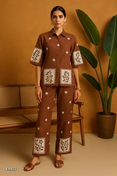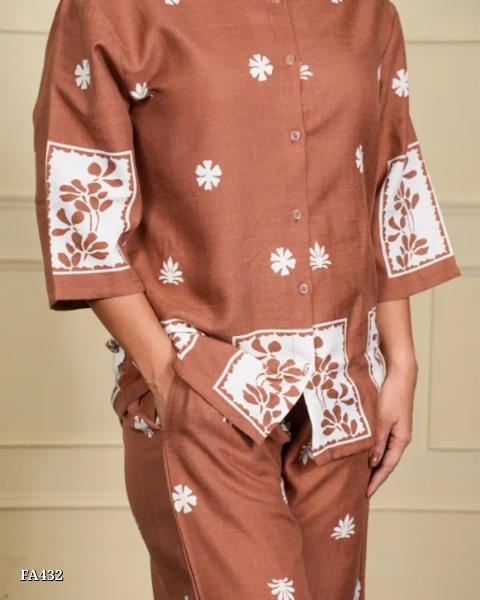 Brown Cotto with White Floral breathable 100% cotton It features a rich terracotta brown color with white floral and geometric block prints on the shirt, sleeves, and pant borders. most importantly, The set includes a collared, button-down short-sleeve shirt and matching straight-fit pants. Firstly Suitable for casual outings,