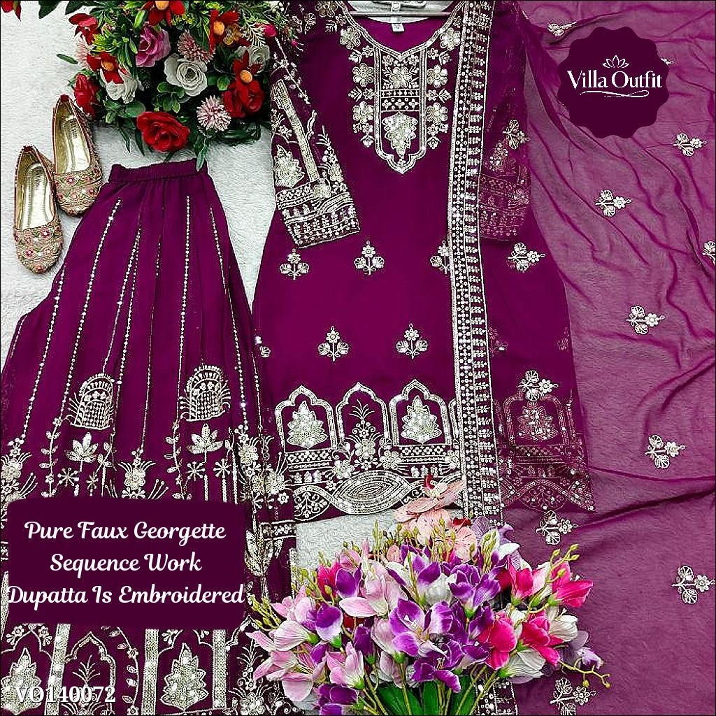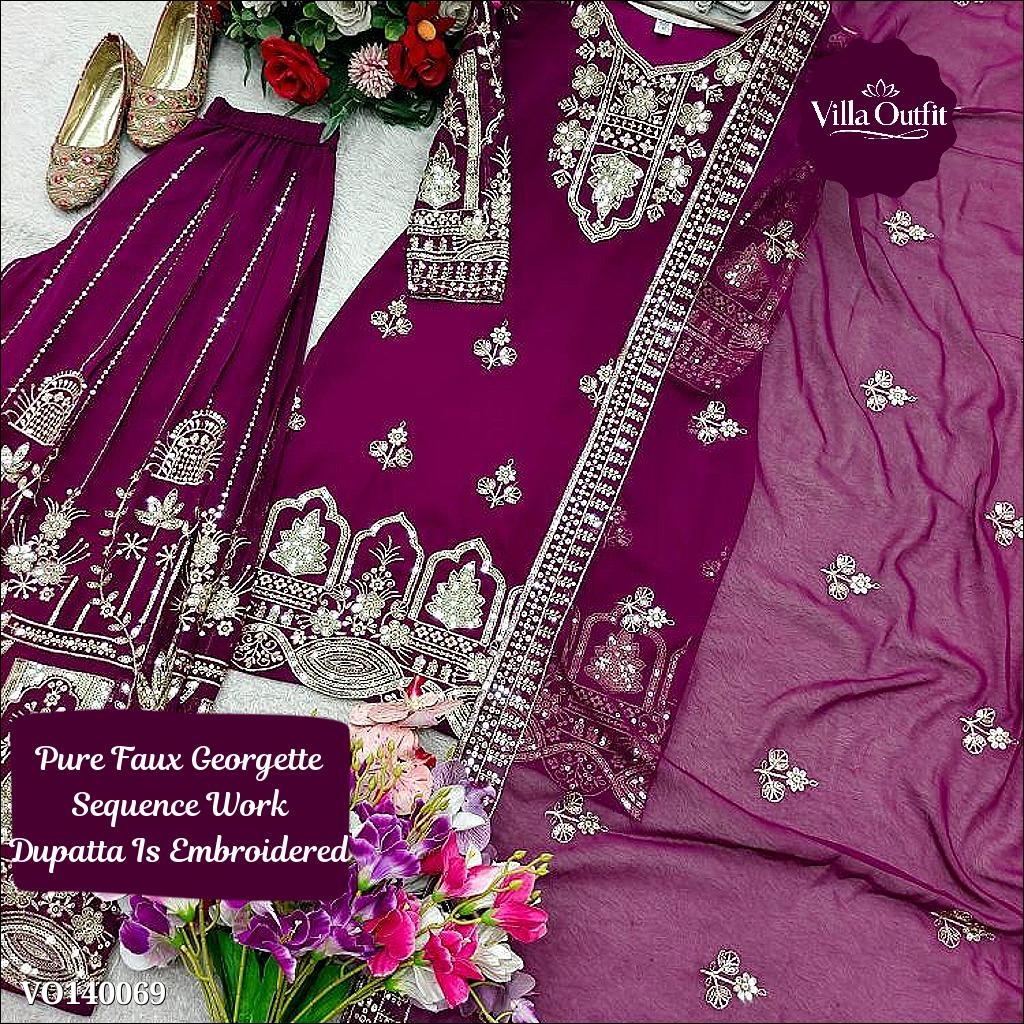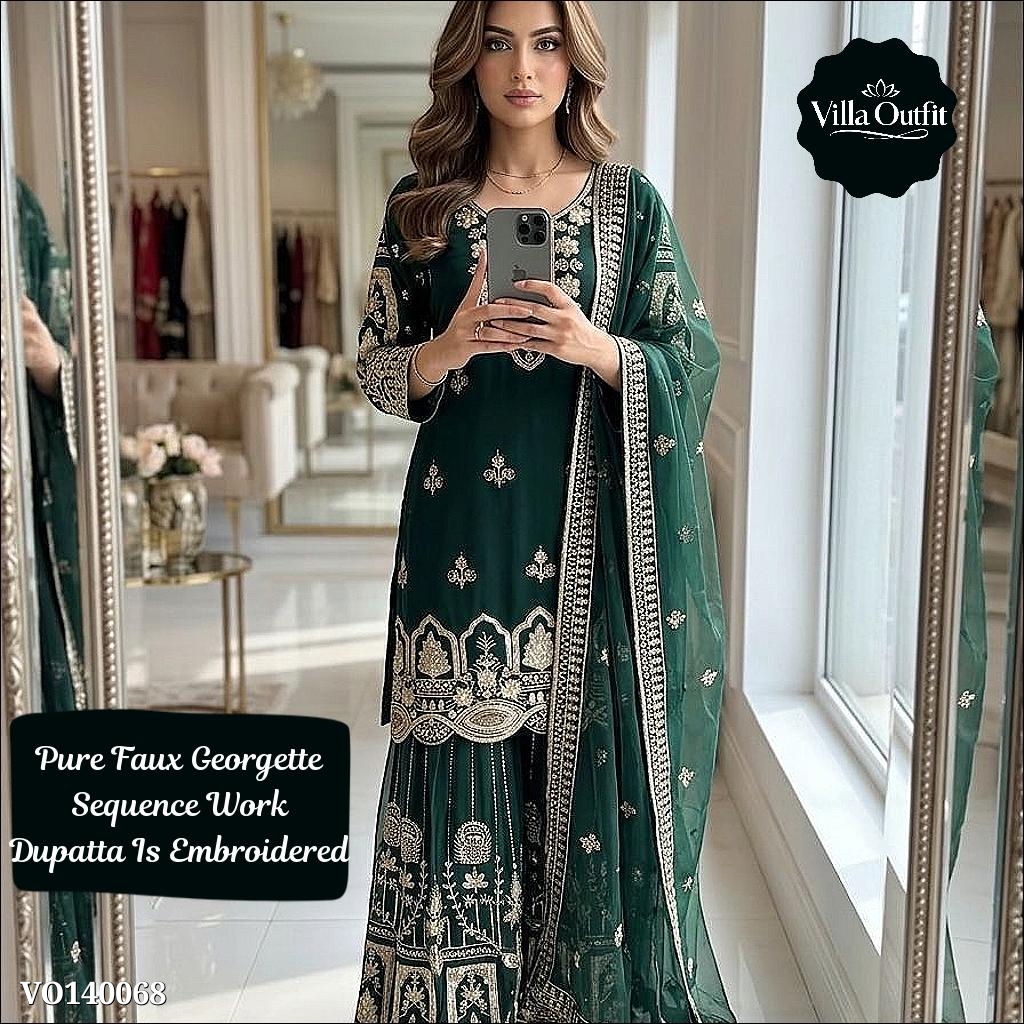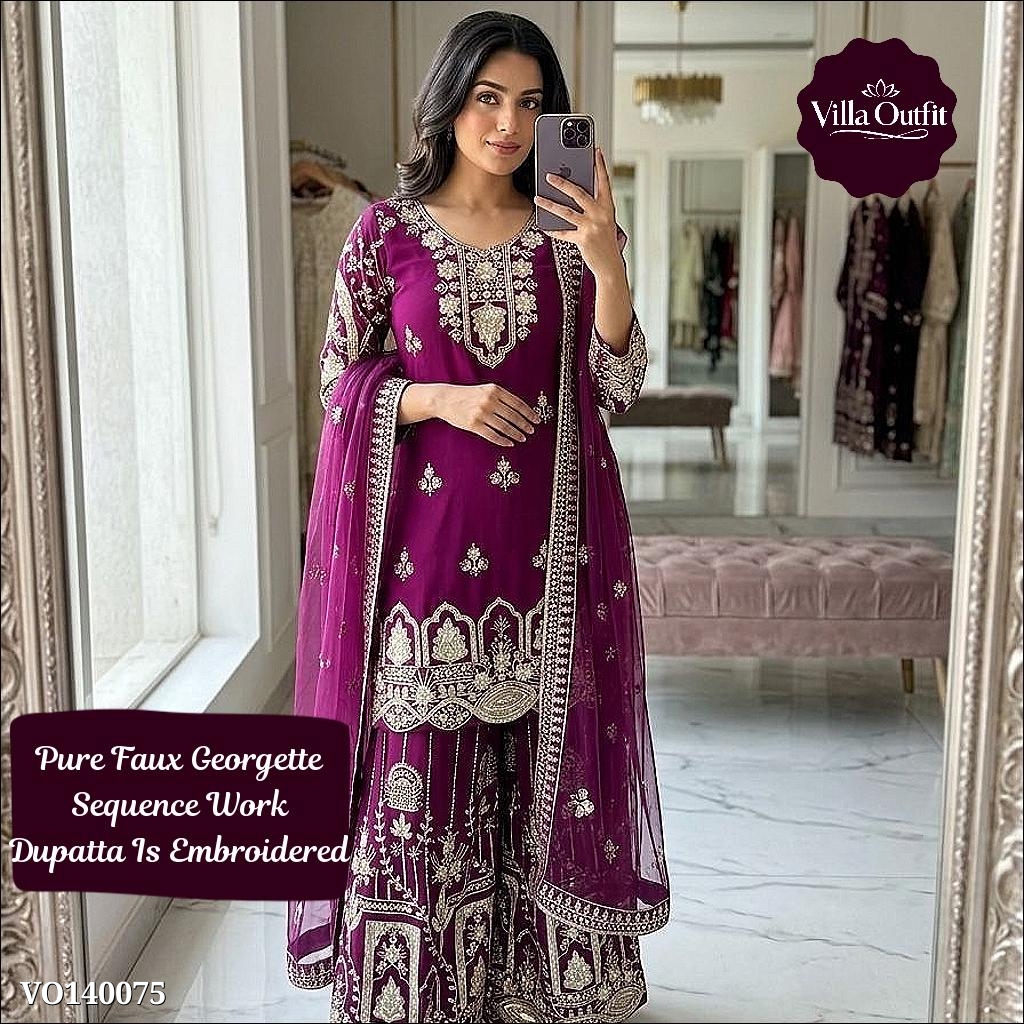 Elevate your ethnic wardrobe with this stunning 3-piece Sarara suit set, crafted from premium Pure Faux Georgette fabric with intricate 5mm sequence embroidery work throughout.