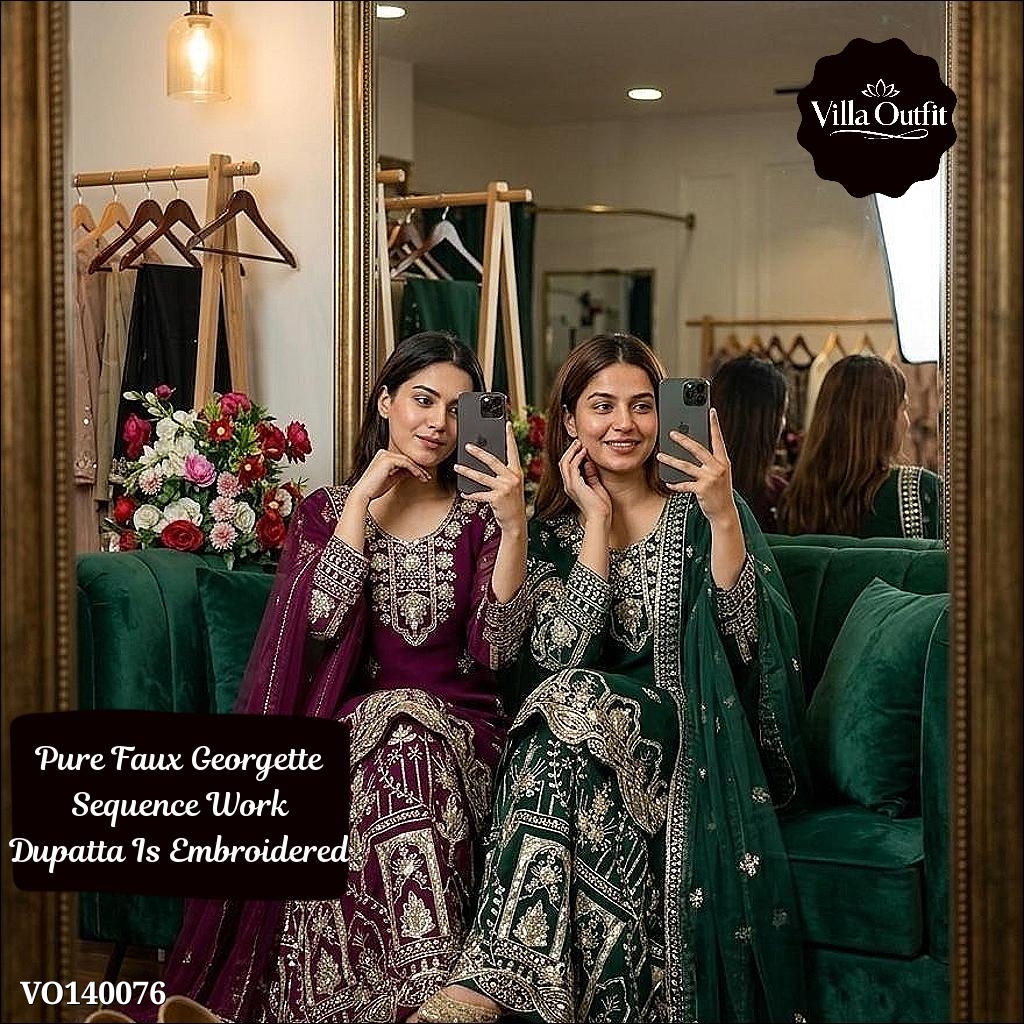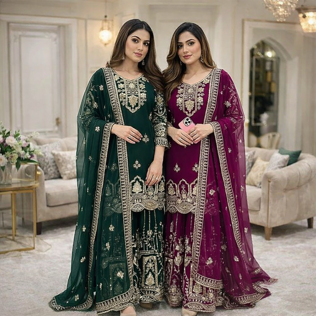 Dupatta: Pure Faux Georgette with matching 5mm sequence embroidery. Length: 2.10–2.15 meters. Fully stitched.
