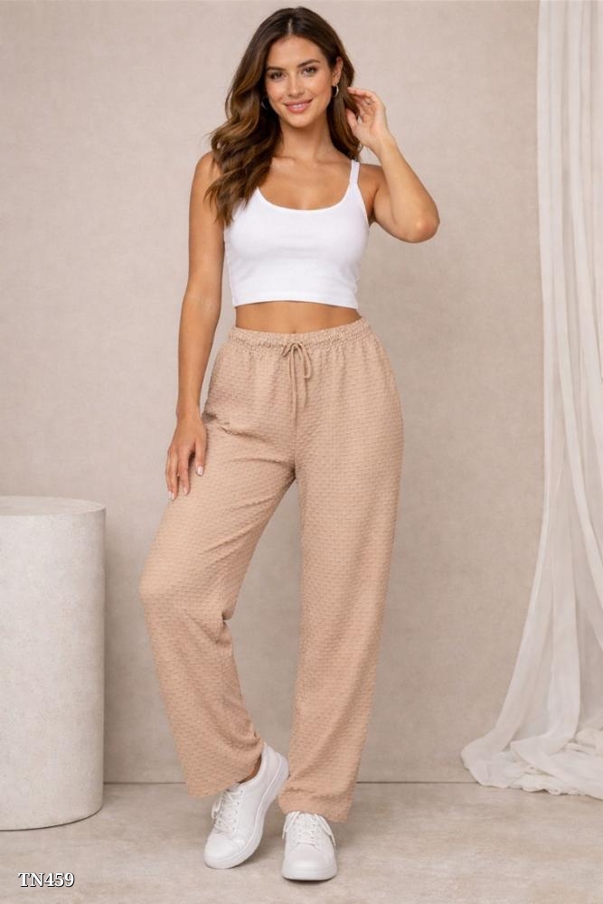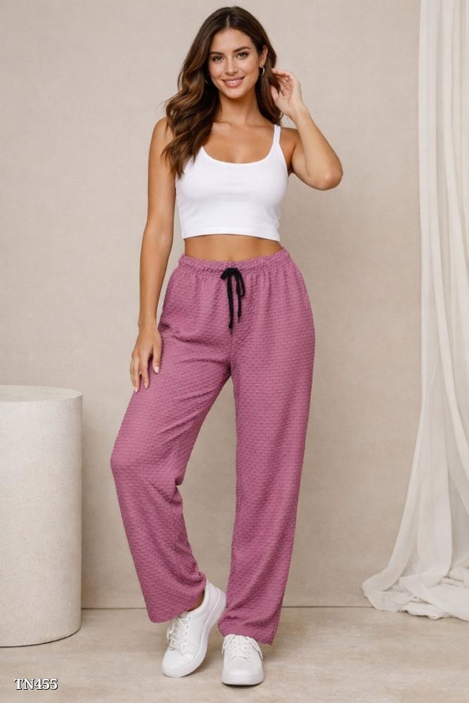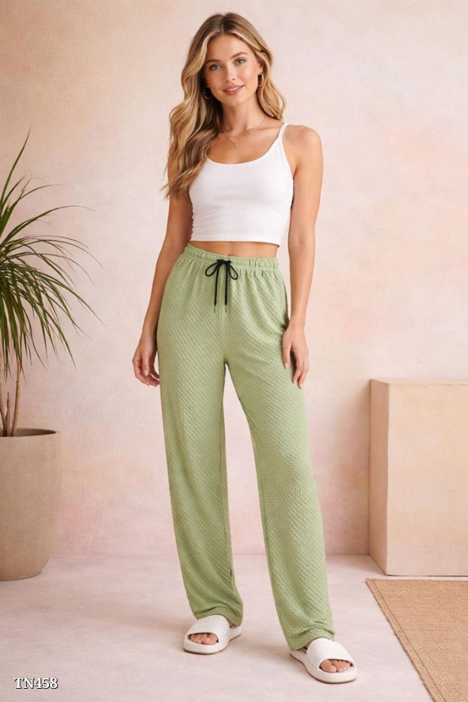 Made from soft, stretchable Lycra fabric, these lounge bottoms are incredibly comfortable for everyday wear. Featuring a textured pattern, elastic waistband, and adjustable drawstring, the relaxed straight-leg fit makes them perfect for casual outings, yoga, gym sessions, or simply lounging at home.